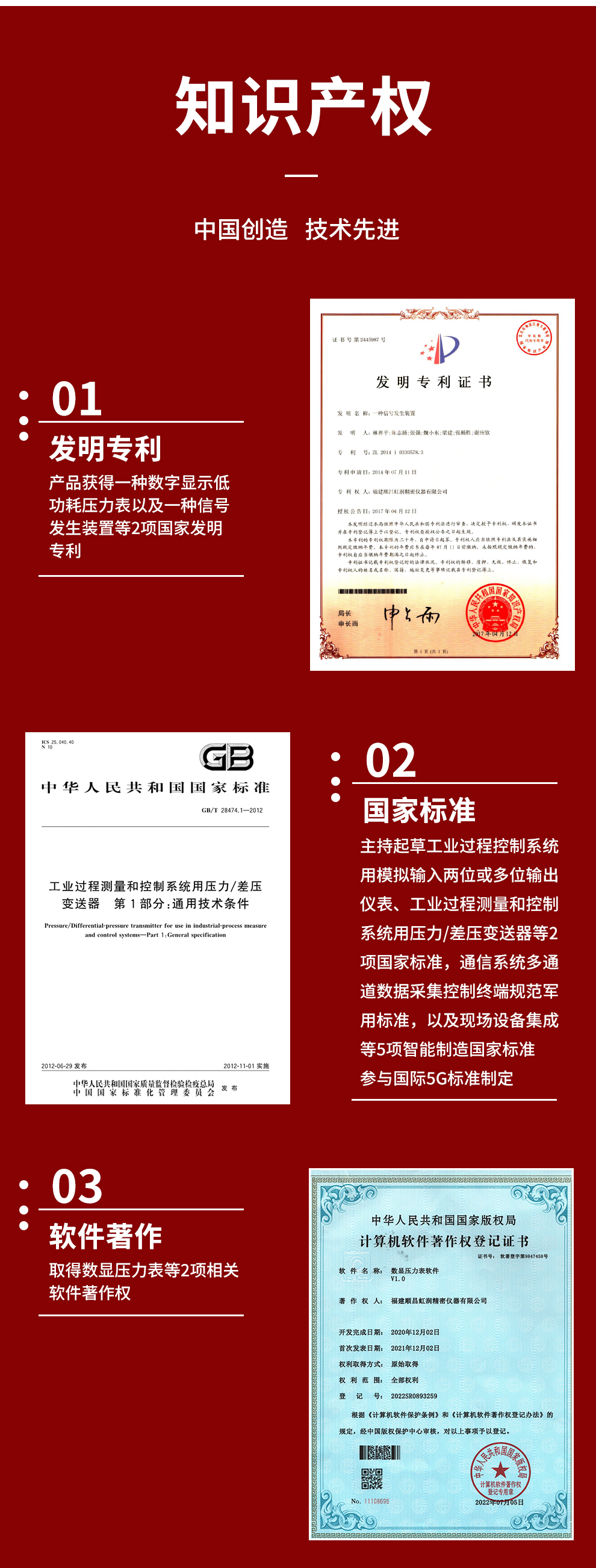 虹潤公司是專業(yè)生產(chǎn)數(shù)顯壓力表的國家專精特新“小巨人”企業(yè)。生產(chǎn)的智能數(shù)字壓力表,具有氣體液體通用,測量精度高,自動溫度補償,響應(yīng)速度快,電池供電低功耗漂移小等特點。產(chǎn)品獲得一種數(shù)字顯示低功耗壓力表以及一種信號發(fā)生裝置等2項國家發(fā)明專利,主持起草工業(yè)過程控制系統(tǒng)用模擬輸入兩位或多位輸出儀表、工業(yè)過程測量和控制系統(tǒng)用壓力/差壓變送器等2項國家標(biāo)準(zhǔn),通信系統(tǒng)多通道數(shù)據(jù)采集控制終端規(guī)范軍用標(biāo)準(zhǔn),以及現(xiàn)場設(shè)備集成等5項智能制造國家標(biāo)準(zhǔn),參與國際5G標(biāo)準(zhǔn)制定,取得數(shù)顯壓力表等2項相關(guān)軟件著作權(quán)。產(chǎn)品廣泛石化、冶金、電力、制藥、食品、航空航天、工業(yè)循環(huán)水系統(tǒng)等諸多領(lǐng)域。
