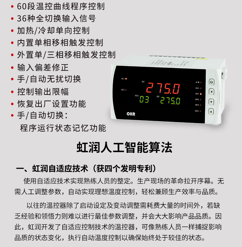 虹潤公司是專業(yè)生產(chǎn)溫控器的國家專精特新“小巨人”企業(yè)。生產(chǎn)的程序段智能溫控器,具有真正人工智能算式,無需人工整定參數(shù),控制精度可達(dá)±0.1°C,60段溫控曲線程序,無超調(diào)、欠調(diào)等特點(diǎn)。產(chǎn)品獲得模糊PID控制儀及控制方法、人工智能調(diào)節(jié)器、智能化控制器、移相觸發(fā)控制器、閥門自動(dòng)手動(dòng)無擾動(dòng)操作控制方法及裝置等5項(xiàng)國家發(fā)明專利,主持起草智能溫度儀表通用技術(shù)條件、工業(yè)過程控制系統(tǒng)用模擬輸入兩位或多位輸出儀表、工業(yè)過程測量和控制系統(tǒng)用智能調(diào)節(jié)器等3項(xiàng)國家標(biāo)準(zhǔn),,以及通信系統(tǒng)多通道數(shù)據(jù)采集控制終端規(guī)范軍用標(biāo)準(zhǔn),參與國際5G標(biāo)準(zhǔn)制定,取得60段PID自整定調(diào)節(jié)器等3項(xiàng)相關(guān)軟件著作權(quán)。產(chǎn)品廣泛應(yīng)用于電力、石化,冶金、制藥、食品等幾乎所有工業(yè)現(xiàn)場,實(shí)現(xiàn)精準(zhǔn)控溫,保障生產(chǎn)安全與質(zhì)量。
