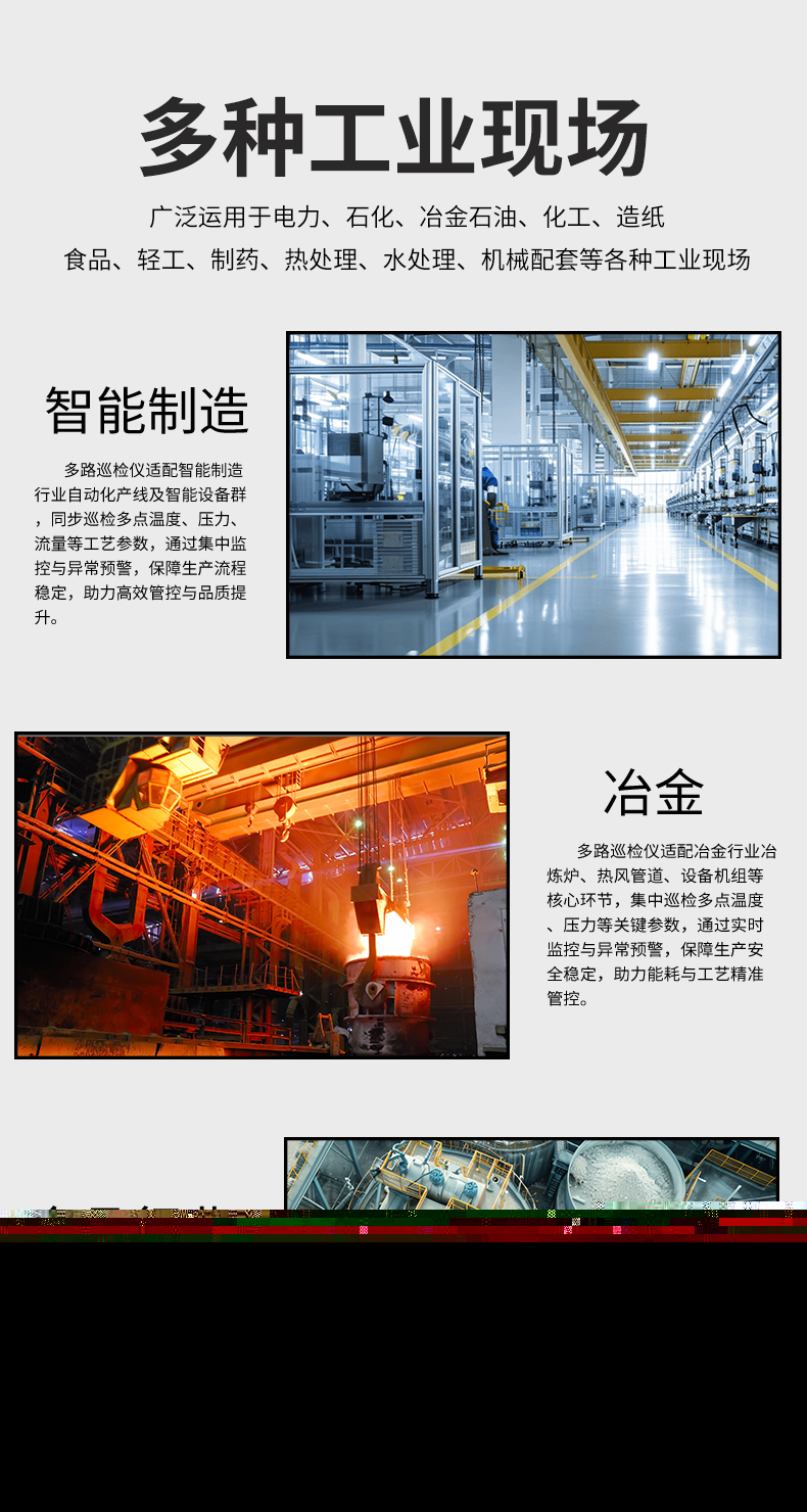 虹潤公司是專業(yè)生產(chǎn)多路溫度巡檢儀的國家專精特新“小巨人”企業(yè),生產(chǎn)的增強(qiáng)型多路巡檢儀,具有8路/16路測量通道,全切換信號(hào)輸入,多種輸出類型,高抗干擾,RS485/RS232通訊等特點(diǎn)。產(chǎn)品獲得巡回檢測顯示方法及裝置、儀表殼體等2項(xiàng)國家發(fā)明專利,主持起草工業(yè)過程控制系統(tǒng)用模擬輸入兩位或多位輸出儀表、物聯(lián)網(wǎng)智能溫度儀表通用技術(shù)條件等2項(xiàng)國家標(biāo)準(zhǔn),以及通信系統(tǒng)多通道數(shù)據(jù)采集控制終端規(guī)范軍用標(biāo)準(zhǔn),參與國際5G標(biāo)準(zhǔn)制定,取得多回路測量顯示控制儀等3項(xiàng)相關(guān)軟件著作權(quán)。產(chǎn)品廣泛應(yīng)用于電力、石化、冶金、制藥、水處理、機(jī)械配套等各種工業(yè)現(xiàn)場。
