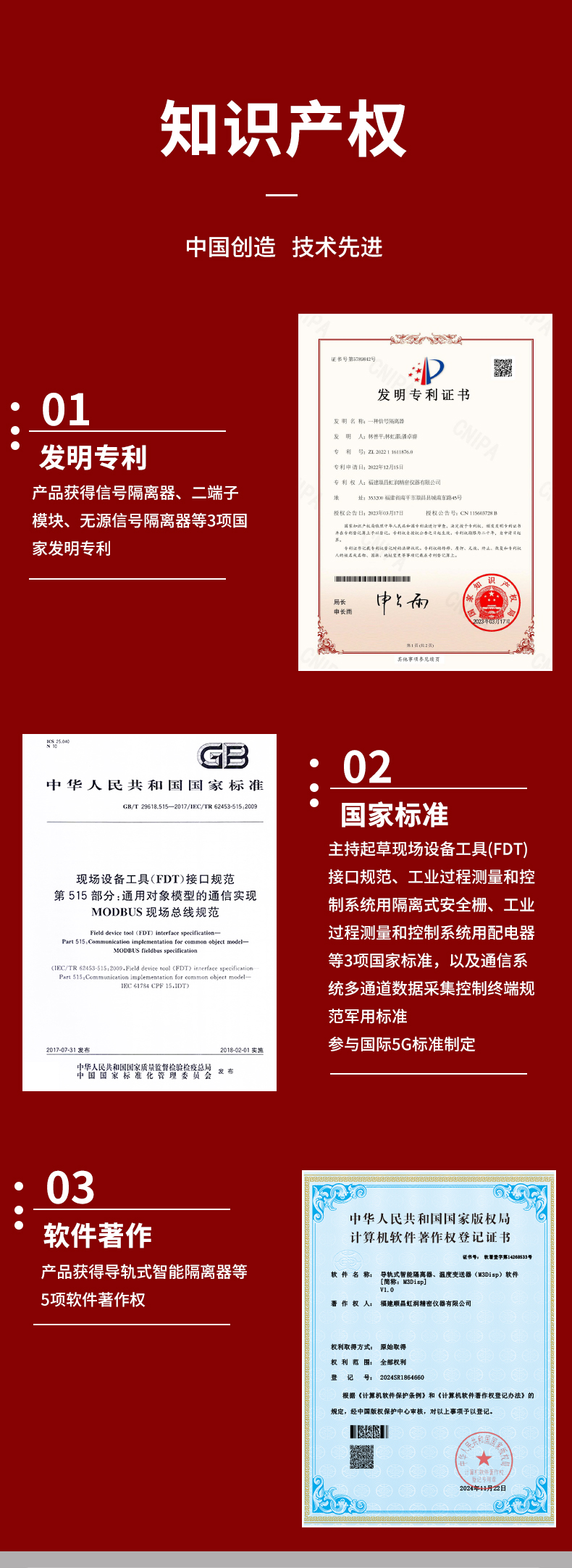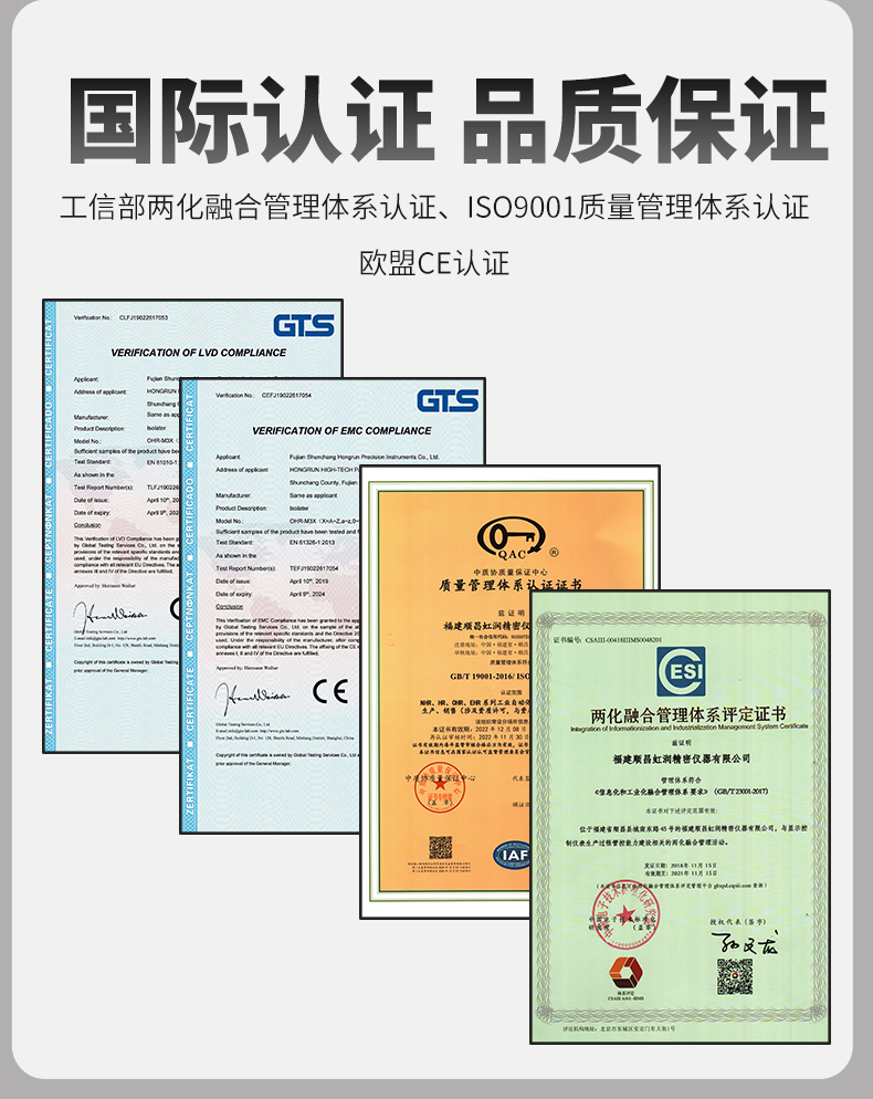虹潤公司是專業(yè)生產(chǎn)隔離器的國家專精特新“小巨人”企業(yè)。生產(chǎn)的智能信號隔離器涵蓋電流電壓變送器、溫度變送器、配電器、頻率轉(zhuǎn)換器、開關(guān)量轉(zhuǎn)換器及通訊轉(zhuǎn)換器等多種產(chǎn)品類型。產(chǎn)品獲得信號隔離器、一種二端子模塊、無源信號隔離器等3項國家發(fā)明專利,主持起草現(xiàn)場設(shè)備工具(FDT)接口規(guī)范、工業(yè)過程測量和控制系統(tǒng)用隔離式安全柵、工業(yè)過程測量和控制系統(tǒng)用配電器等3項國家標準,以及通信系統(tǒng)多通道數(shù)據(jù)采集控制終端規(guī)范軍用標準,參與國際5G標準制定,取得導(dǎo)軌式智能隔離器、頻率轉(zhuǎn)換器等3項相關(guān)軟件著作權(quán)。產(chǎn)品廣泛電力、冶金、工業(yè)電爐、變電站、高壓電機房等需要電隔離的工業(yè)自動化控制系統(tǒng)。